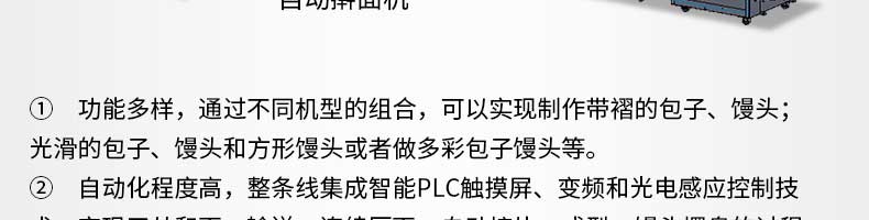 智能包子馒头生产线,功能多样,通过不同机型的组合,可以实现制作带褶的包子、馒头;光滑的包子、馒头和方形馒头或者做多彩包子馒头等