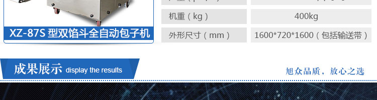 XZ-87S型双馅斗全自动九州jiuzhou(中国),可生产各种肉包、肉菜包、菜包、小笼包、汤包、水晶包、圆馒头、奶黄包、豆沙包、叉烧包、南瓜饼等几十种包馅制品。适用于宾馆、饭店、学校、机关企业食堂、馒头或包子加工厂、早餐工程店及速冻食品厂等单位。可满足不同客户群体。免费提供工艺技术。免费上门培训指导安装。