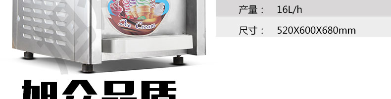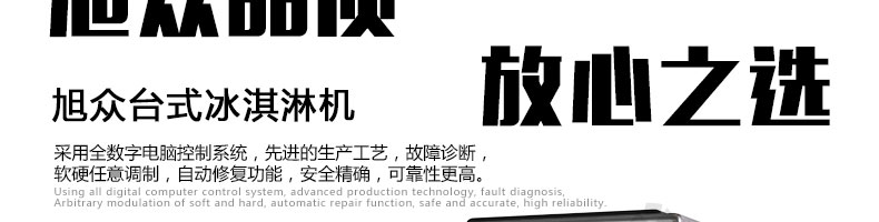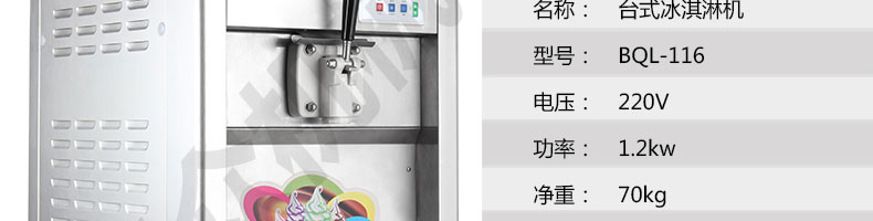 BQL-116台式冰淇淋机,●选用国际名牌成熟制冷配套件和高效压缩机,融合旭众精湛工艺辅以严格的质量控制流程,使产品整体性能及品质得以全面提升。●采用全数字电脑控制系统,选用名牌优质电器元件,先进的生产工艺,故障诊断,软硬任意调制,自动修复功能,安全精确,可靠性更高。●专业成熟制冷系统设计,选用世界名牌大功率专用压缩机,大大缩短冰淇淋成型时间,相同时间内冰淇淋产量大幅度增加,使您生意火爆时依然得心应手,为您创造财富。●安全平稳的机械搅拌系统,噪音更低、振动更小,使整机运行性能达到国际先进水平。●确保进料温度在0°C~35°C;环境温度5°C~40°C匀可正常使用。