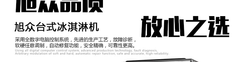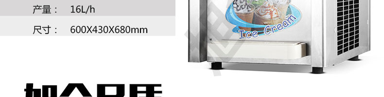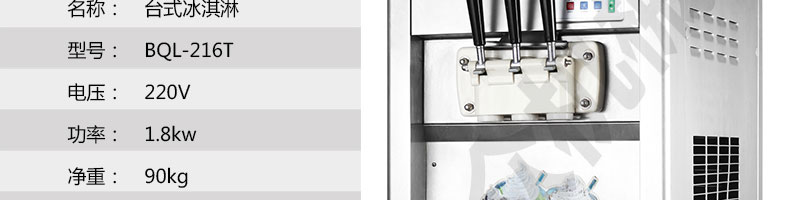 BQL-216T台式冰淇淋机,●选用国际名牌成熟制冷配套件和高效压缩机,融合旭众精湛工艺辅以严格的质量控制流程,使产品整体性能及品质得以全面提升。●采用全数字电脑控制系统,选用名牌优质电器元件,先进的生产工艺,故障诊断,软硬任意调制,自动修复功能,安全精确,可靠性更高。●专业成熟制冷系统设计,选用世界名牌大功率专用压缩机,大大缩短冰淇淋成型时间,相同时间内冰淇淋产量大幅度增加,使您生意火爆时依然得心应手,为您创造财富。●安全平稳的机械搅拌系统,噪音更低、振动更小,使整机运行性能达到国际先进水平。●确保进料温度在0°C~35°C;环境温度5°C~40°C匀可正常使用。