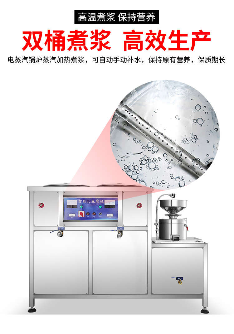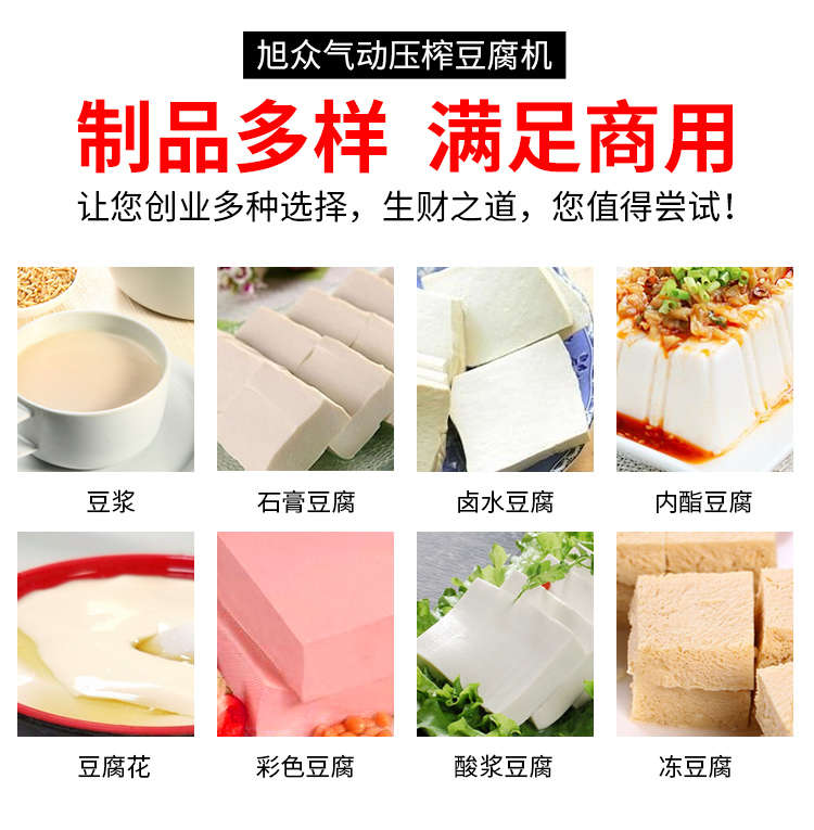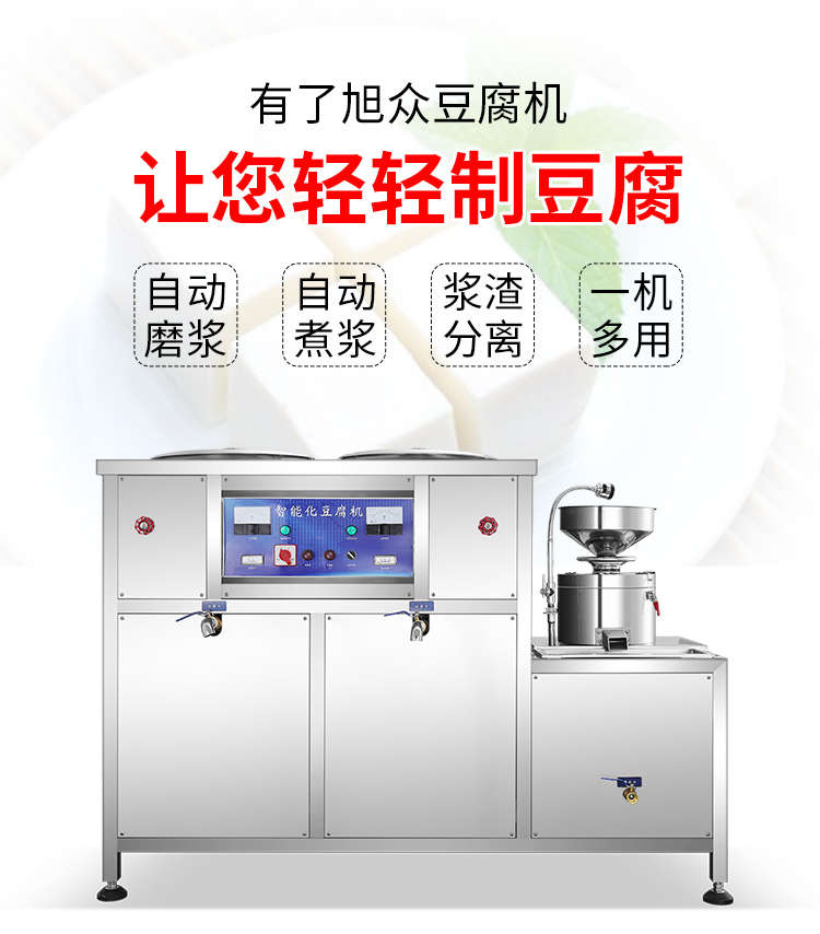 XZ-300型气动压榨豆腐机,智能豆腐豆浆机,双桶煮浆高效生产现磨现煮,浆渣分离快速出浆。机器运行稳定不锈钢材质打造,坚固耐用,安全卫生,时尚大方,易于清洗。