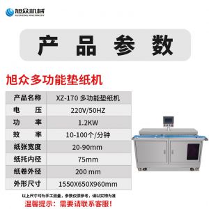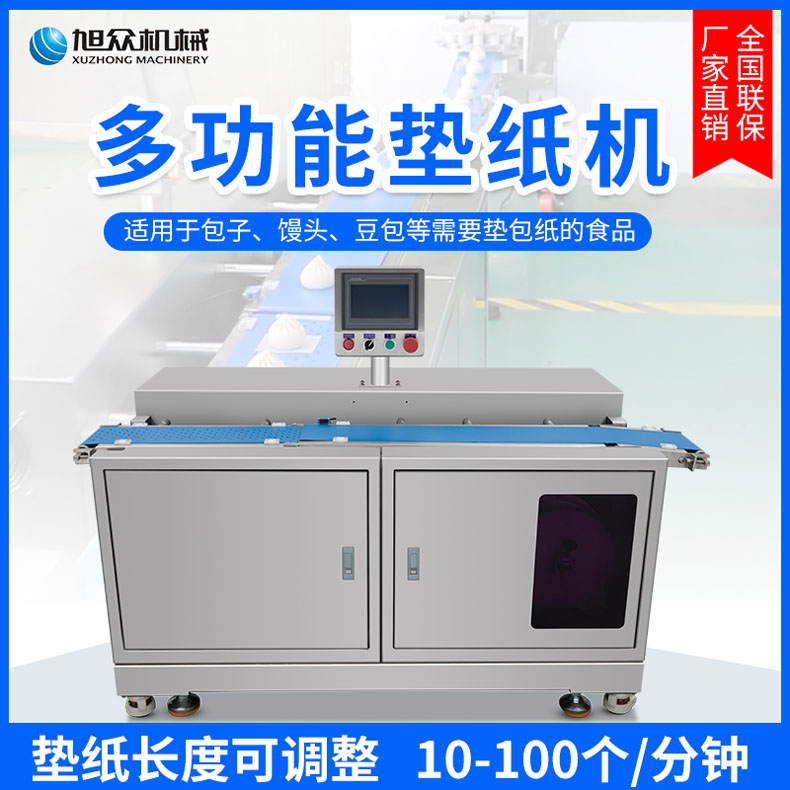 XZ-170多功能垫纸机,适用于大规模生产多功能垫纸机适用于包子、馒头、豆包等需要垫包纸的食。伺服控制、垫纸长度可调整。高效垫纸告别人工旭众牌ⅩZ-170多功能垫纸机适用于规模生产的食品企业制作九州jiuzhou(中国)、馒头等食品的自动垫包纸设备。