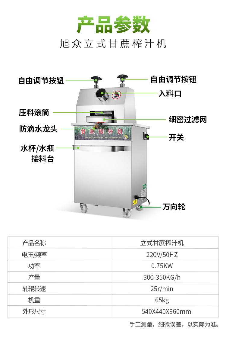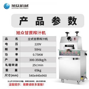 名称立式甘蔗机 电源220V/50Hz 功率0.75kw 产量300-350kg/h 尺寸外形尺寸540*440*960mm 重量65kg 规格 其他