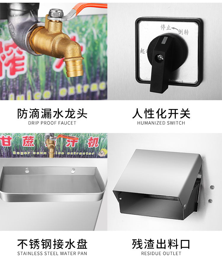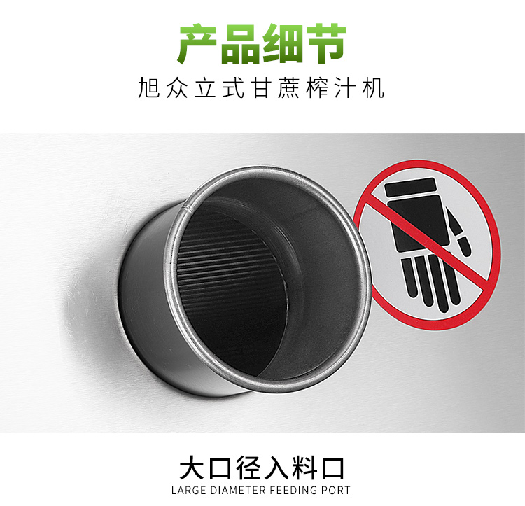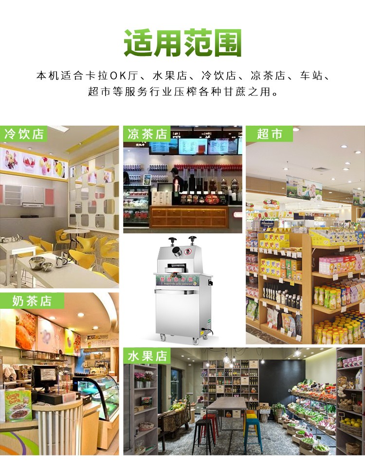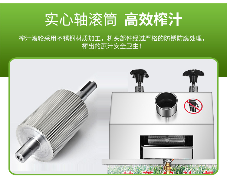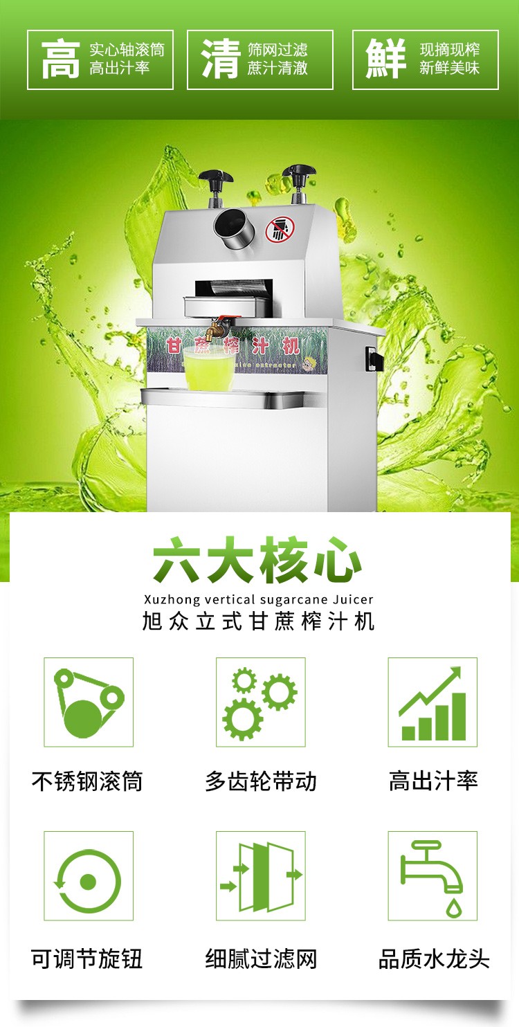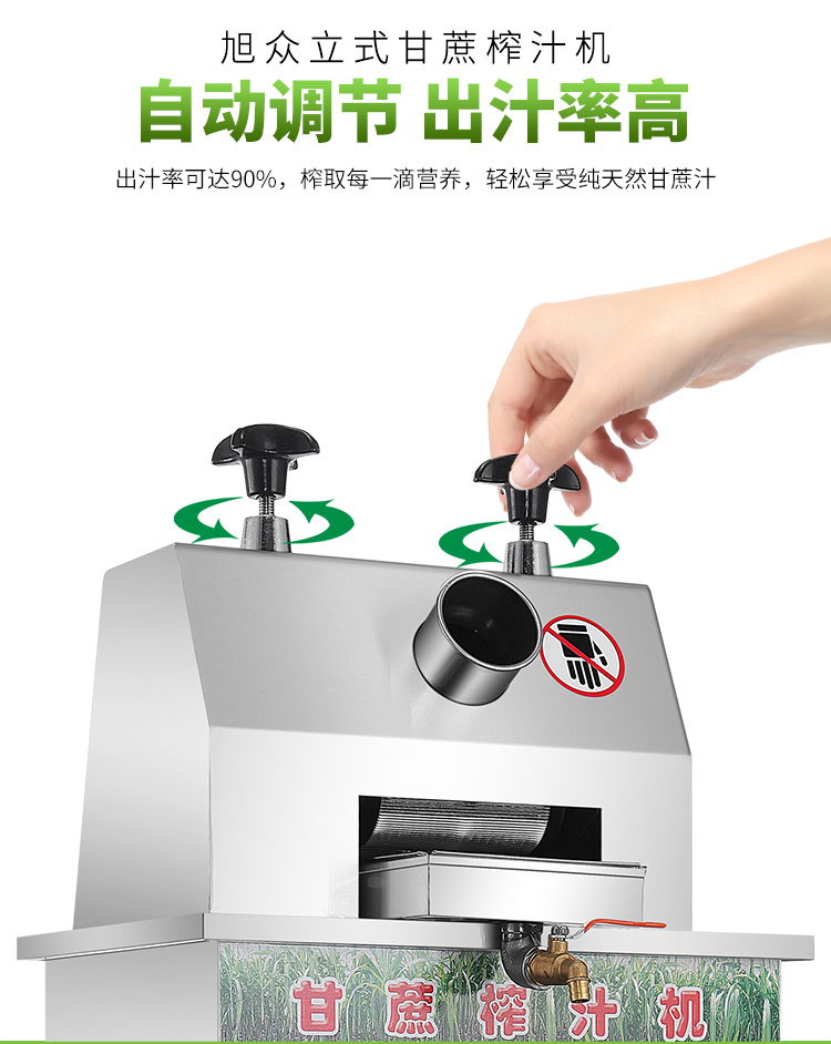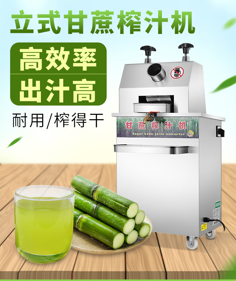 立式甘蔗机,该机采用不锈钢材质加工,机头部件都经过严格的防锈仿腐蚀处理,整机采用全封闭结构,可内置蔗渣桶,保证渣汁不外泄,安全、干净、卫生。 适合宾馆、卡拉OK厅、水果店、冷饮店、凉茶店、车站、超市等服务行业压榨各种甘蔗之用。