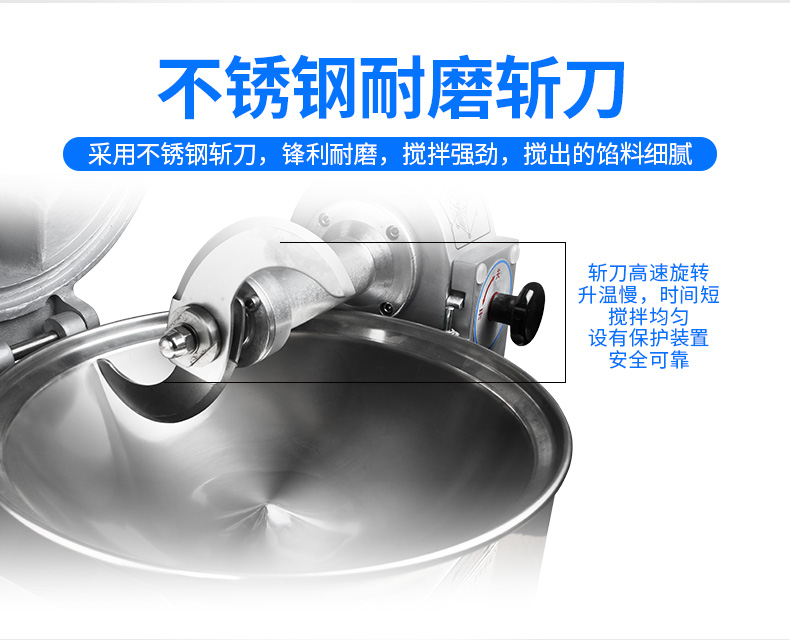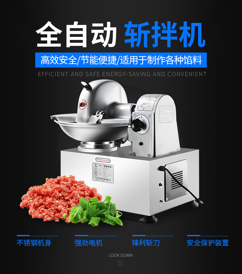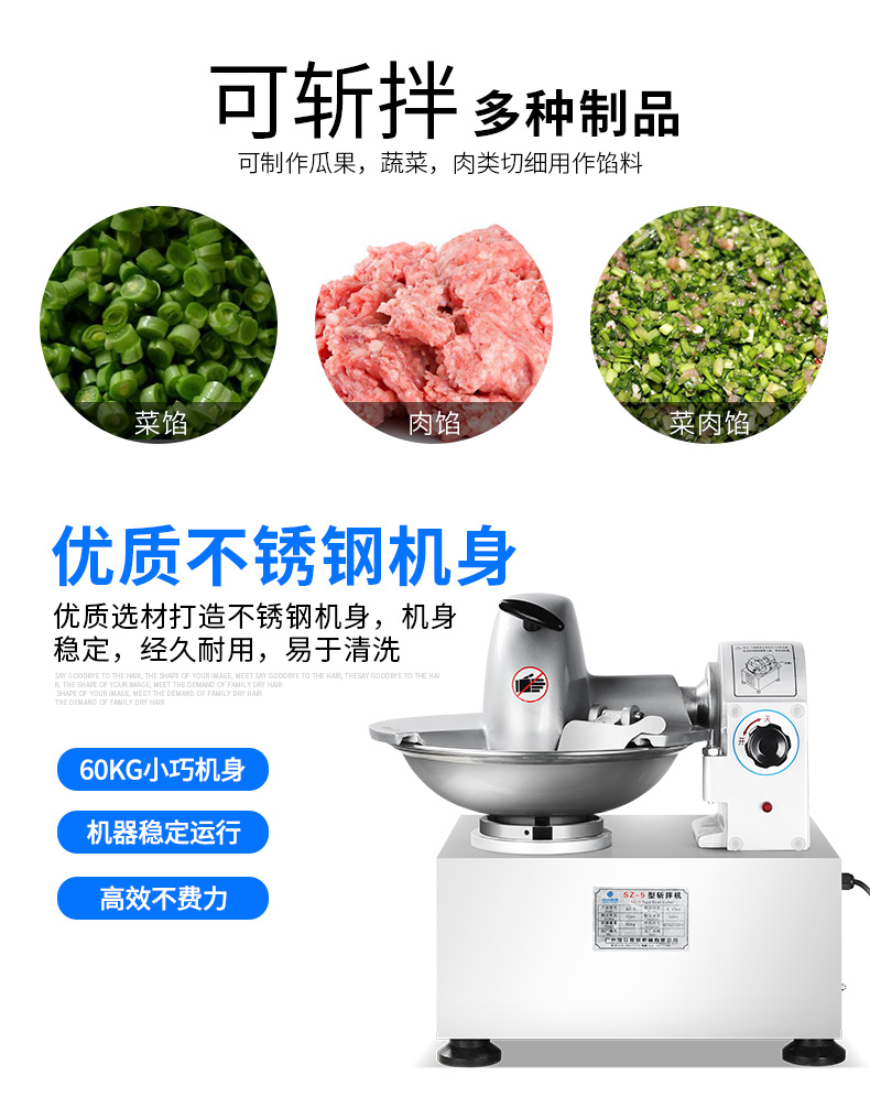 SZ-5型斩拌机,全自动斩拌机,高效安全、节能便捷、适用于制作各种馅料。可斩拌多种制品,可制作瓜果,蔬菜,肉类切细用作馅料。优质选材打造不锈钢机身,机身稳定,经久耐用,易于清洗。