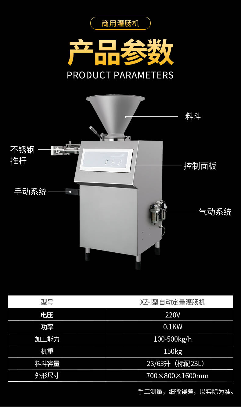 XZ-I型自动定量灌肠机,使用优质不锈钢制造,符合食品机械的要求,只需1人操作,特别适合中小型肉食加工厂使用,以各种畜禽类肉糜为原料的香肠、火腿肠、热狗等天然肠衣、蛋白肠衣、烟熏肠衣等制品,可以灌制定重量单肠,也可连续灌制长肠。