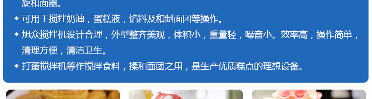 SZM10、15、20、25、30搅拌机系列,可用于搅拌奶油、蛋糕液、馅料及和制面团等操作。打蛋搅拌机等作搅拌食料、揉和面团之用,是生产优质糕点的理想设备,适用于酒店、饭店、学校部门、面包屋以及食品厂家。