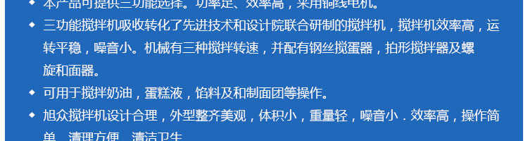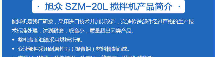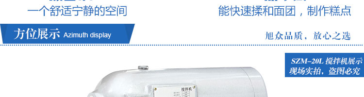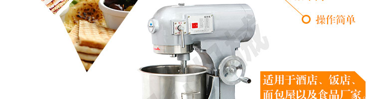 SZM-20型四功能搅拌机,可用于搅拌奶油、蛋糕液、馅料及和制面团等操作。打蛋搅拌机等作搅拌食料、揉和面团之用,是生产优质糕点的理想设备,适用于酒店、饭店、学校部门、面包屋以及食品厂家。