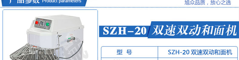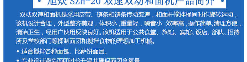 SZH-20型双速双动和面机,本机适合搅拌各种面包、包子、馒头、汤圆、披萨饼面团,专业设计避免面团过分升温并确保面团含氧量。过载、缺相保护装置,防护罩安全连动装置。