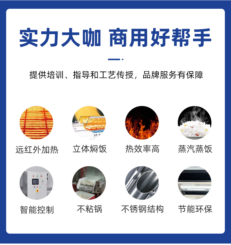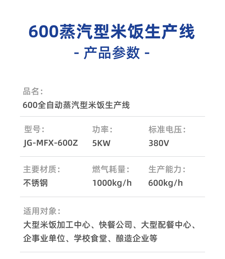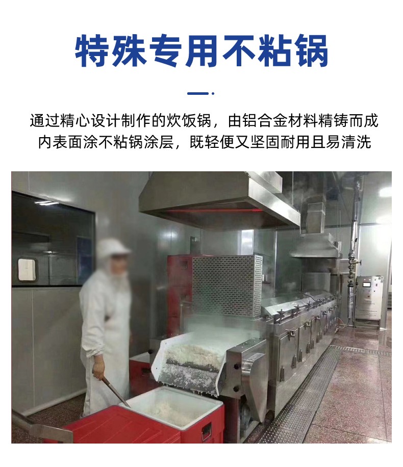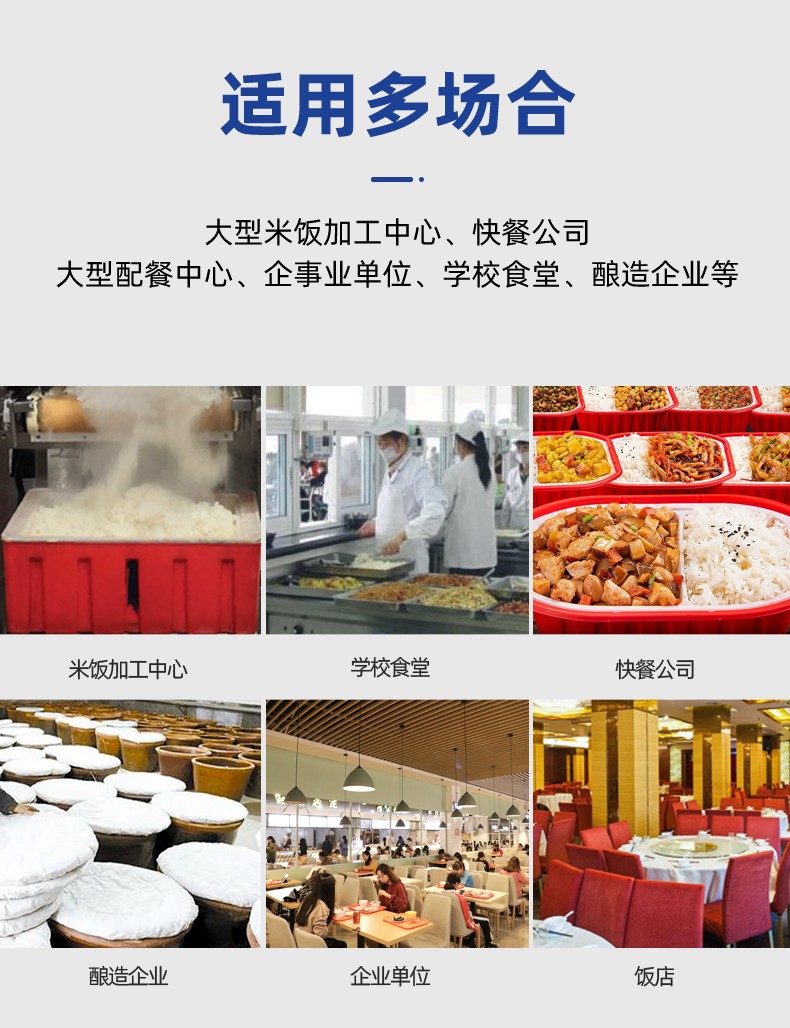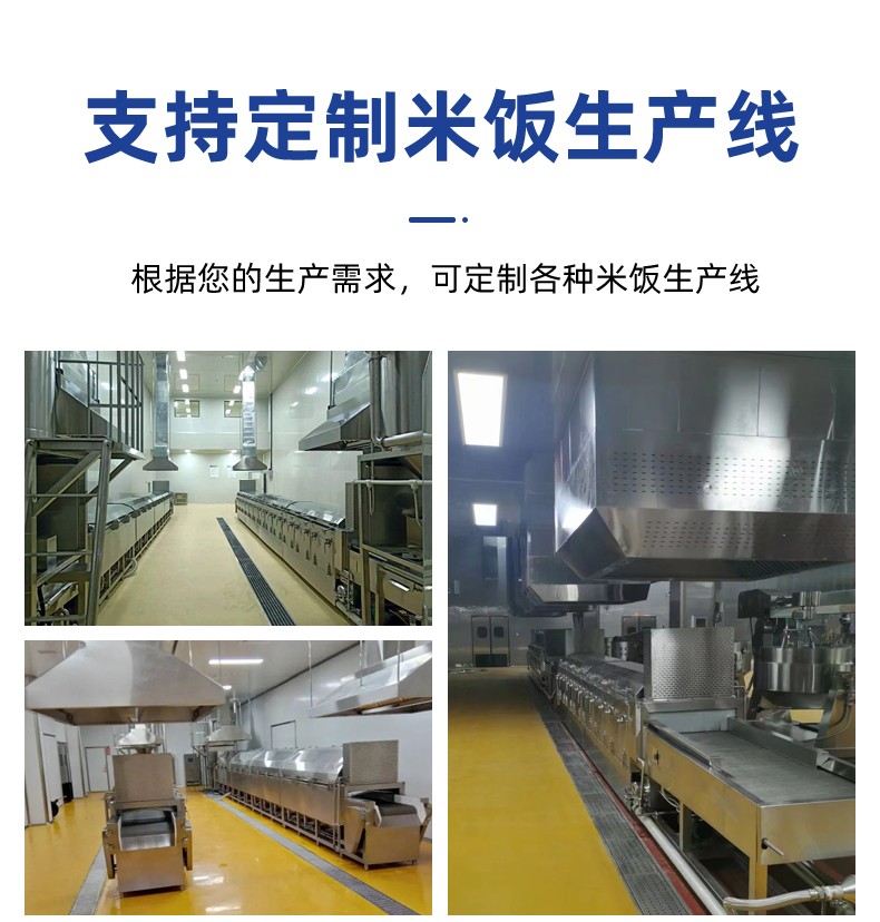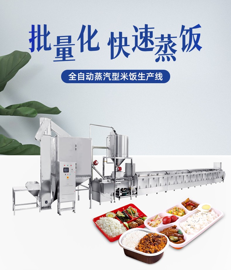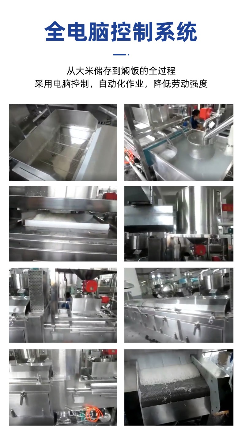 全自动蒸汽型米饭生产线,全电脑控制系统,从大米储存到焖饭的全过程采用电脑控制,自动化作业,降低劳动强度。实现全自动生产,多功能,一机多用,可以用于在蒸制各种食物实现全自动生产,无需人工服务。