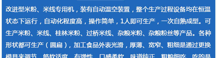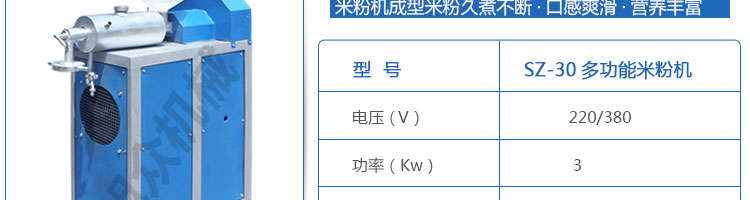 SZ-30米粉机,生产多样性可生产米粉、米线、粉丝、粉条、、年糕、玉米面条、各种杂粮粉丝、各种面条、杂粮面条、彩色面条以及以红薯、玉米、大豆、蚕豆等制成淀粉为原料的等多种食品而且每种食品厚薄、粗细等规格可根据需要任意调整。