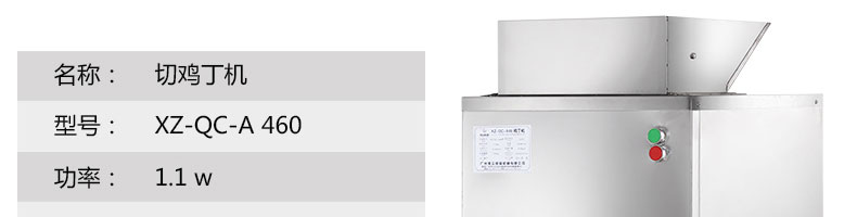 XZ-QC-A460切丁机,切鸡丁机适合将带软骨的禽类,如鸡、鸭、鹅、鸽、鱼类等切成块(丁)状。本系列设备工作效率高,采用不锈钢制作,美观耐用,切割快速,少碎骨。
