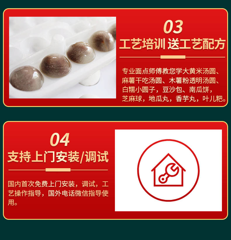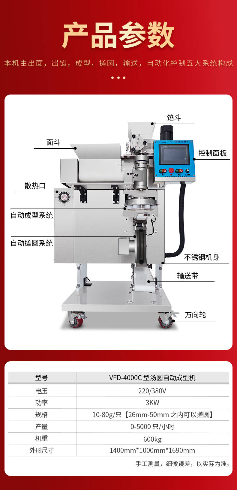 VFD-4000型汤圆自动成型排盘一体机,本机依外皮及馅料的种类不同,可制作汤圆、豆沙包、南瓜饼、奶黄包、含馅馒头、玉兔包等包馅食品的设备。工作效率高、相当于8-12个工人同时制作汤圆,真正低收入、高收效、省钱省工。适合用于各种工作场所。免费上门安装,赠送工艺