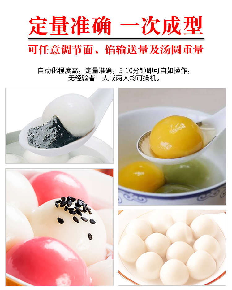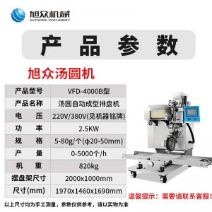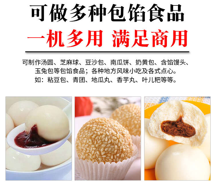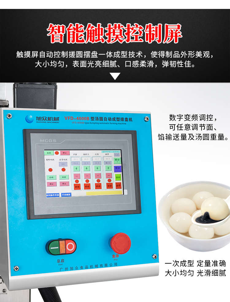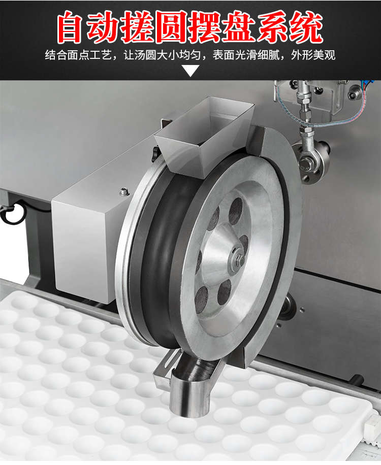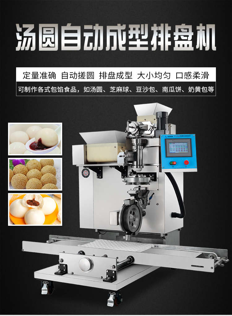 VFD-4000B汤圆机,定量准确自动搓圆排盘成型大小均匀口感柔滑。可制作各式包馅食品,如汤圆、芝麻球、豆沙包、南瓜饼、奶黄包等