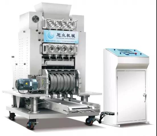 XZ4T-1502型多头汤圆成型排盘机是一款依外皮及馅料的种类不同,可制作出汤圆、豆沙包、南瓜饼、奶黄包、含馅馒头、玉兔包等包馅食品,并可自动排盘的设备。功能齐全,适用性广,自动化程度高,定量准确,操作简单,只要将面团与馅料放入进料口,开机便可自动搓圆、成型,制品不易变形。