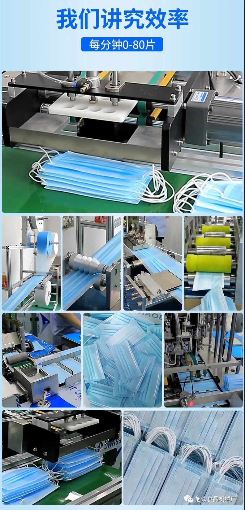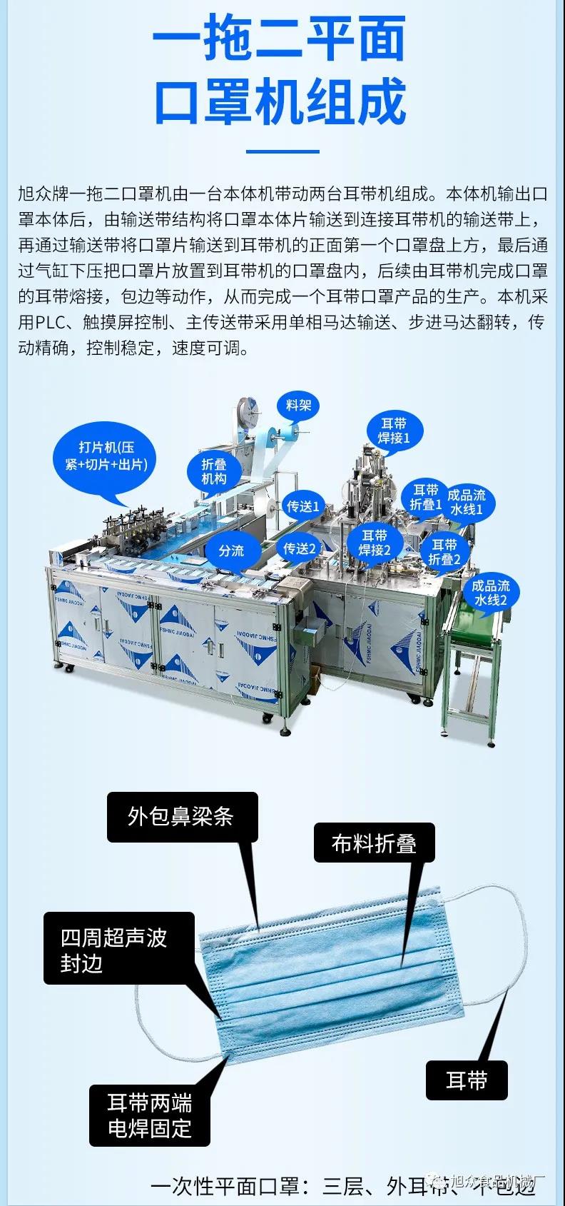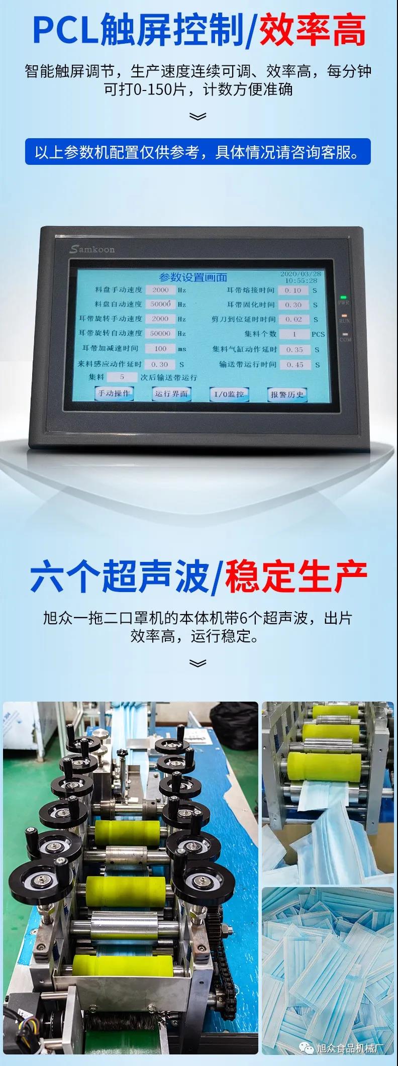 旭众牌一拖二口罩机由一台本体机带动两台耳带机组成。本体机输出ロ罩本体后,由输送带结构将口罩本体片输送到连接耳带机的输送带上,再通过输送带将口罩片输送到耳带机的正面第一个口罩盘上方,最后通过气缸下压把口罩片放置到耳带机的口罩盘内,后续由耳带机完成口罩的耳带熔接,包边等动作,从而完成一个耳带口罩产品的生产。本机采用PLC、触摸屏控制、主传送带采用单相马达输送、步进马达翻转,传动精确,控制稳定,速度可调。