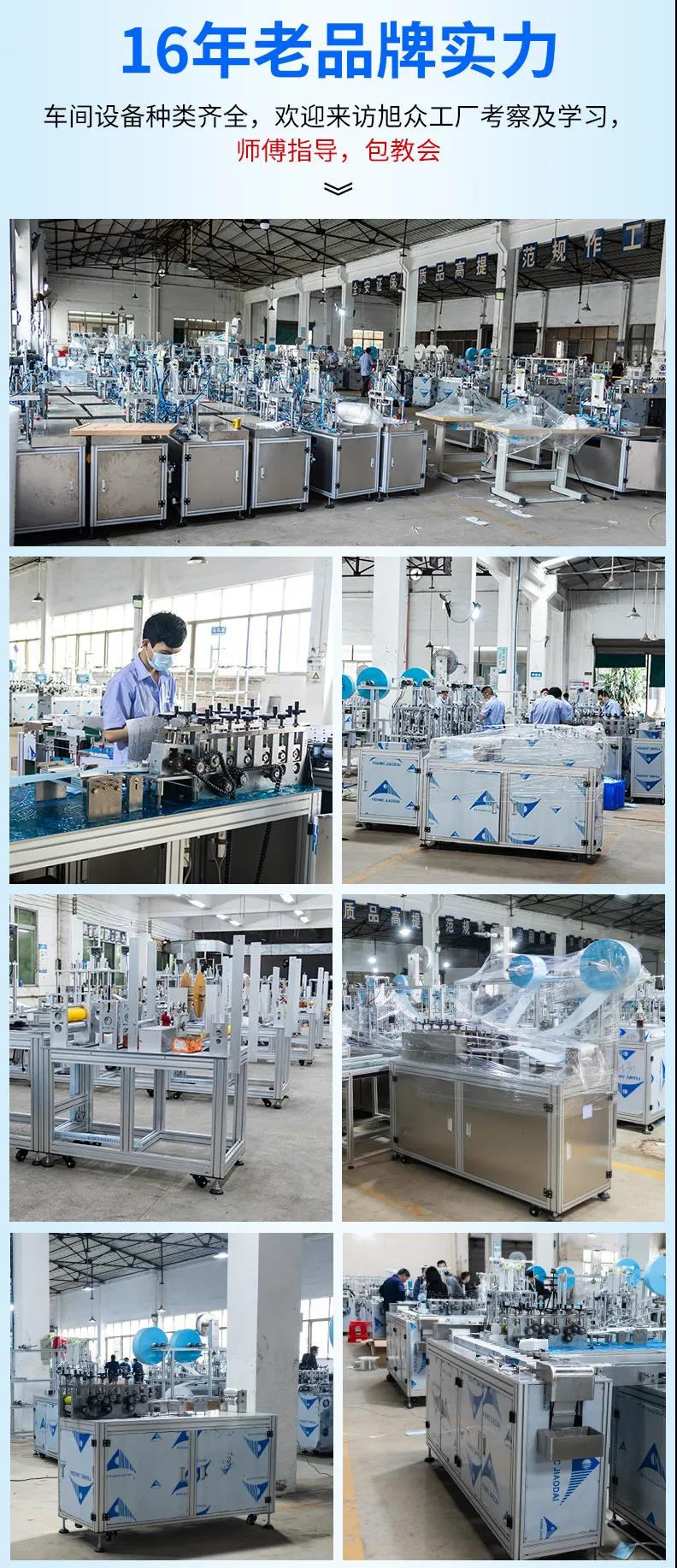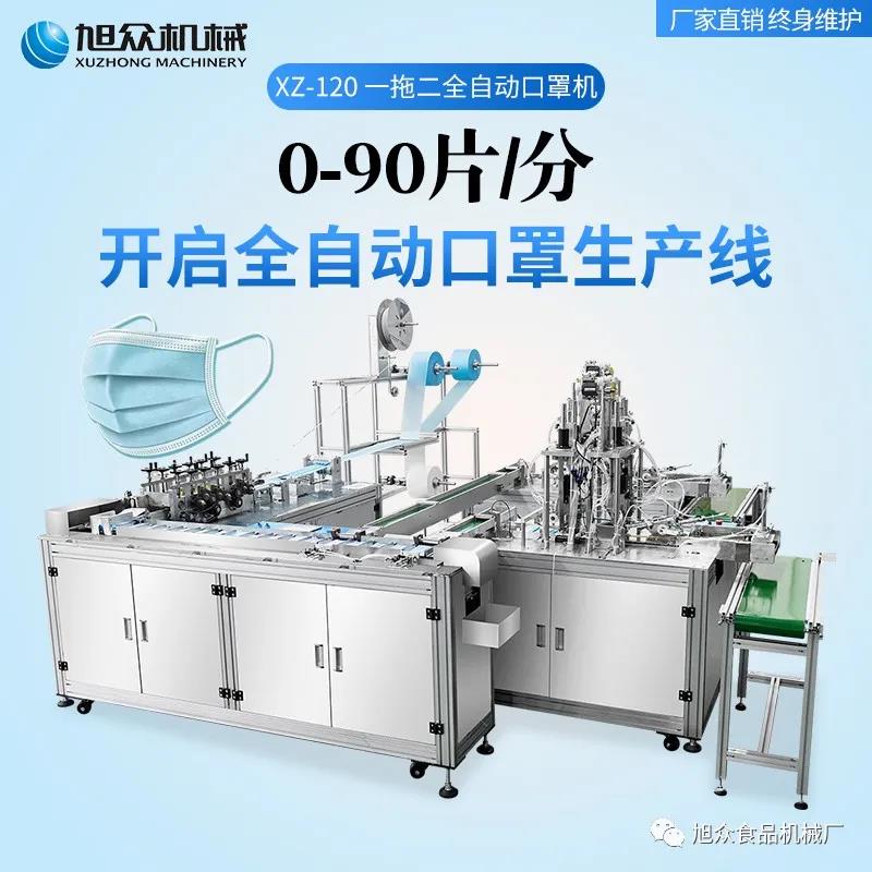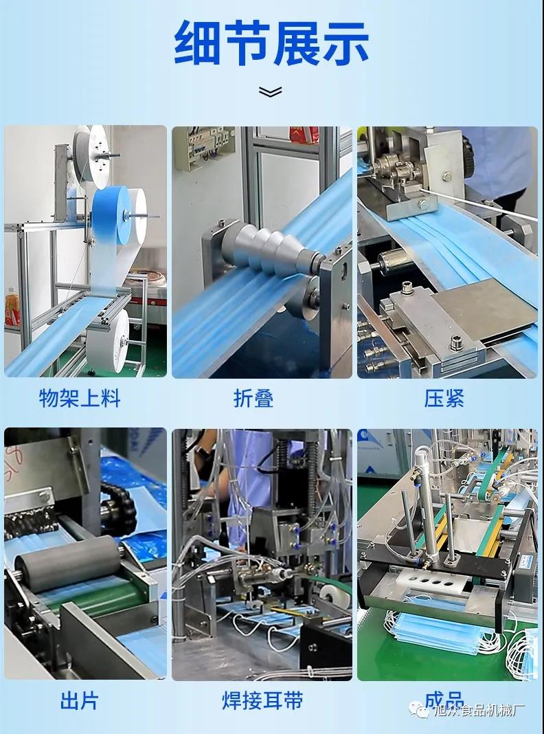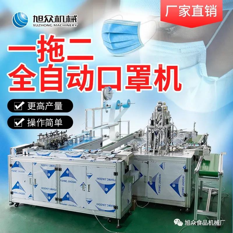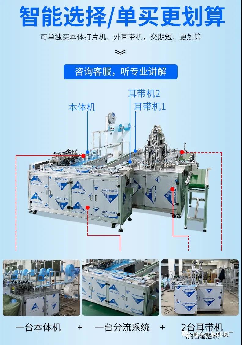 旭众牌一拖二口罩机由一台本体机带动两台耳带机组成。本体机输出ロ罩本体后,由输送带结构将口罩本体片输送到连接耳带机的输送带上,再通过输送带将口罩片输送到耳带机的正面第一个口罩盘上方,最后通过气缸下压把口罩片放置到耳带机的口罩盘内,后续由耳带机完成口罩的耳带熔接,包边等动作,从而完成一个耳带口罩产品的生产。本机采用PLC、触摸屏控制、主传送带采用单相马达输送、步进马达翻转,传动精确,控制稳定,速度可调。