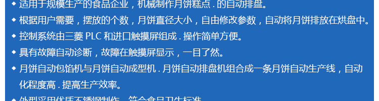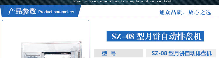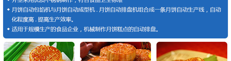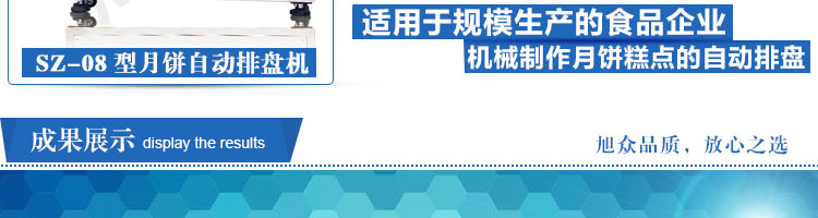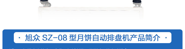 SZ-08型月饼自动排盘机,可同于制作各种月饼。适用于蛋糕房、休闲食品厂、食品加工产、面包房、月饼加工厂、超市、学校、食堂等各种工作场所。可满足不同客户群体。免费提供工艺技术。